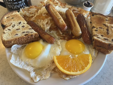 I met up with our mutual friend, Shannon, in Prince George for bunch (image below). Of course, we took a selfie. Shannon is no longer on social media. I wish I could do the same. I do social media for my job, but I guess I could step away as well. Anyway, I chose to go to Grama’s Kitchen at Grama’s Inn for brunch. My other friend took me there a couple of months ago and I loved it, so I wanted to go back again. As you can see with the image above, the breakfast feature of two eggs, hashbrowns, toast, and sausage is HUGE and I chose items that remind me of my mom, like sausage and shredded hashbrowns, but Shannon had her eggs poached, ordered bacon, and chose to have the potato “cubes” with grilled onion. Damn. I love the permutations. We both had coffee and chatted for a good couple of hours. I love catching up with Shannon and I love spending “be a person day” connecting with friends and having a restaurant breakfast (aka., my favourite). The meal was very satisfying, much like the conversation, and I brought my raisin toast home to have for breakfast at another time. I thought it was serendipitous to have planned and meet on Nina’s birthday. Nina had a huge impact on both of us and believe that Nina brought us together in some way to celebrate her birthday. She was that kind of person. Selfless, always in service. Nina was an incredible person, much like Shannon. We decided to meet again next month, but go somewhere else. We gabbed for a bit in the parking lot and decided to rate and review each restaurant we go to.